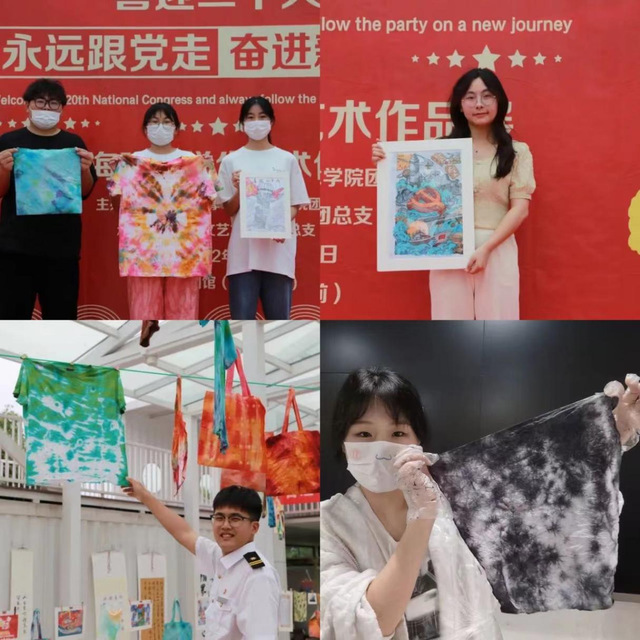 本次展览集中展示了“喜迎二十大、永远跟党走、奋进新征程”三个主题团日的艺术作品,包括书画艺术展、百米长卷绘画活动、扎染手工艺术作品等。现场艺术气氛浓厚,布置精心。每一份原创作品都别具匠心、形式多样,倾注了同学们的心血。同学们以画传情将爱党爱校的情节流露到画面中,用笔抒发对党和国家的热爱。