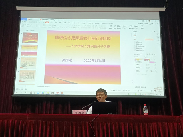 6月1日晚18:30,人文艺术学院邀请学院关工委常务副主任吴国建老师在图书馆大报告厅做题为《理想信念是照耀我们前行的明灯》专题讲座,人文学院全体积极分子参与本次讲座。