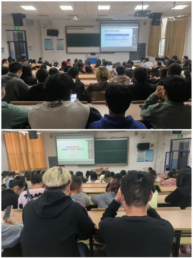 学事办主任张洁首先向毕业生介绍了岗位实习的工作要求,主要包括学生实习单位的安排、三方协议的签订、实习期间学生管理三个方面,对学生实习的相关事宜做了详细介绍。学术办主任李珊英向同学们详细介绍了岗位实习管理平台和毕业设计(论文)管理平台,对工学云平台的使用、岗位实习应提交材料、毕业设计过程及毕业设计应提交材料做了详细讲解。