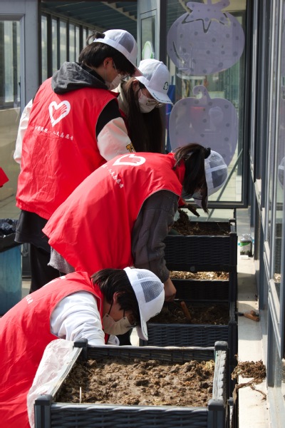 睿泽机构的袁老师向志愿者们介绍了目前机构内学生的基本情况以及今天的工作内容,并带领志愿者们参观园内环境。随即志愿者们开启了一天的陪伴时光。志愿者们来到睿泽阳台上的小菜园,将乱堆乱放的杂物和破损的花盆进行了集中清理,用镰刀、铁锹铲除遗留杂草、翻盆换土,播撒新的种子,迎接“新的生命”。不久后,小菜园焕然一新。志愿者们播种的种子承载着美好的希冀和似火的热情,相信在不久后的一天,定会取得收获。
