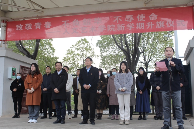3月27日,人文艺术学院在田径场举行新学期升旗仪式。党委学生工作部副部长、学生工作处副处长刘昊,人文艺术学院党总支书记裘黎滨,院长王丽莉,全体辅导员、班主任及全体在校学生参加升旗仪式。升旗仪式由党总支副书记邹国庆主持。