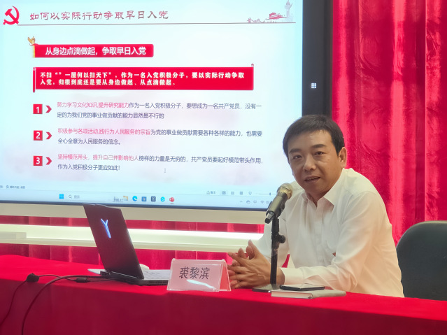 开班仪式结束后,人文艺术学院党总支书记裘黎滨作题为《如何端正入党动机》的专题讲座。裘黎滨详细介绍了中国共产党成立至今带领中国人民从站起来、富起来到强起来的波澜壮阔的历史,围绕中国共产党的三大历史贡献、对党的认识以及党员的权利和义务、树立正确的入党动机、如何以实际行动争取早日入党等四个方面,强调了入党动机的重要性。他要求每名学员都应该以党章为根本遵循,不仅要在组织上入党,更要在思想上、行动上入党,不断增进对党的认识,将党章党纪内化于心,外化于行。他希望全体学员能够以党员标准严格要求自己,从身边做起、从点滴做起,自觉加强党性锻炼,努力提高综合素质,发挥先锋模范作用,争取早日加入中国共产党。