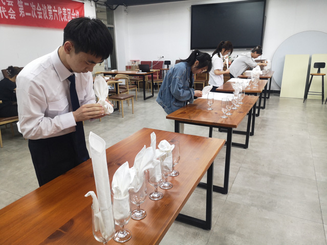 本次比赛,分为理论考试、中餐主题宴会设计方案、口布折花等几个环节,全面考察学生餐厅服务技能的各个方面。特别是决赛中,选手们需根据前期提供的主题宴会设计方案中的折花设计,现场进行口布折花并做简单介绍,充分考验了选手们的基本功、设计能力、口语表达能力。选手们也表现出了过硬的专业技能和心理素质。
