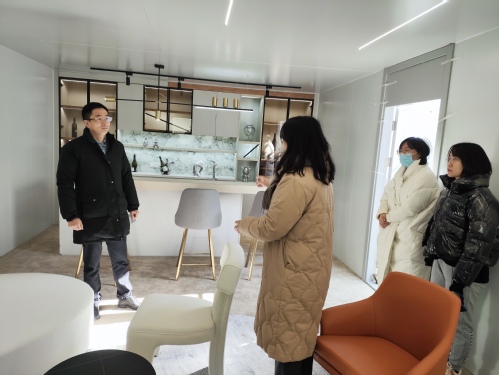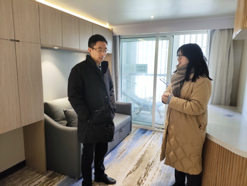 王丽莉院长对孙延建主任一行表示热烈欢迎,随后就邮轮内装现场工程师项目运行情况进行了介绍,希望能够借助产教融合服务平台加强现场工程师优秀案例的经验学习和专家指导,宋岚老师介绍了项目建设工作的编制情况和人才培养方案内容。之后一同参观了邮轮内装标准示范舱、邮轮休息室和1+X邮轮内装技术考证基地。孙延建主任肯定了邮轮内装现场工程师项目建设的推进工作和已有成果,并指出岗位能力标准与人才评价标准的制定在项目实施中的重要性和关键性,为进一步推进邮轮内装现场工程师项目工作提供了重要的指导意见。