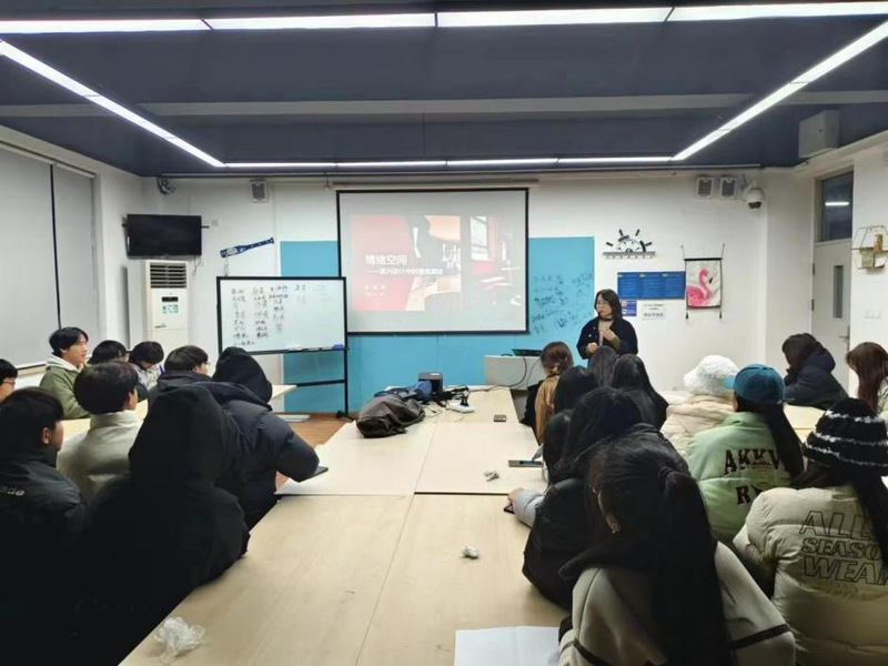 在四场讲座中,王楠老师通过展示各项目化工作室的学生优秀作品,使同学们了解艺术设计项目化课程的学习内容和要求;陈砚池教授以“AIGC时代,设计与设计教育的危机与对策”为题,鼓励同学们主动学习前沿知识,关注技术发展动态;宫继萍博士以“情绪空间——室内设计中的视觉表达”为题,通过火锅店餐饮空间设计案例,分析室内设计中元素的提取表达,色彩材质的应用和照明设计;沈琦副教授以“学设计、做设计”为题,引导同学们关注设计,并将设计理论转化为设计能力。同学们通过讲座学习对专业方向、课程内容、技术领域有了一定的认识和思考。