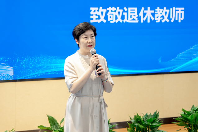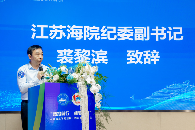 校纪委副书记裘黎滨致辞。裘黎滨总结了学院的特色和经验,回顾了在学院工作6年半的来时之路和奋斗之路,他表示,2017年上任时立下的两大目标,即“打造有温情的人文大家庭”和“谋求人文学院正确坐标”都达成了,更名为邮轮与艺术设计学院后,学院不变的是实现毕业生高质量就业、点燃年轻教师职业理想和激情的成长目标;是全体师生共同完成具有挑战性的历史转型的奋斗目标;是铭刻于心的为党育人、为国育才的初心使命。