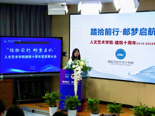 邮轮学院院长王丽莉在大会上致辞,“回顾这十年,在座的历任领导都为了人文艺术学院的成立、发展,做出了巨大贡献。每一项成果都离不开全体师生的辛勤付出,是老师们的辛勤耕耘,是同学们的努力拼搏,共同成就了学院今日的成绩。”
