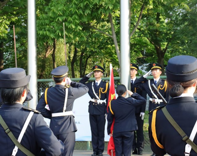清晨七点整,升旗仪式正式开始。国旗护卫队队员们昂首阔步,迈着铿锵有力的步伐,护送着鲜艳的五星红旗入场。伴随着慷慨激昂的《义勇军进行曲》,五星红旗冉冉升起,全体师生肃穆而立,注目致礼。
