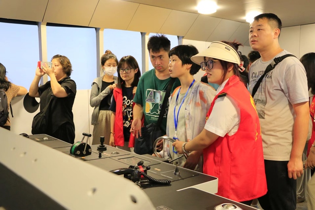 随后学员们参观了航海模拟器。在志愿者的讲解与指导下,学员们在航海仿真实训室操纵船舶,体验纽约港进港航行过程,通过亲自掌握航向,控制航速,体验航海的惊险与刺激,感受航海科技的魅力。