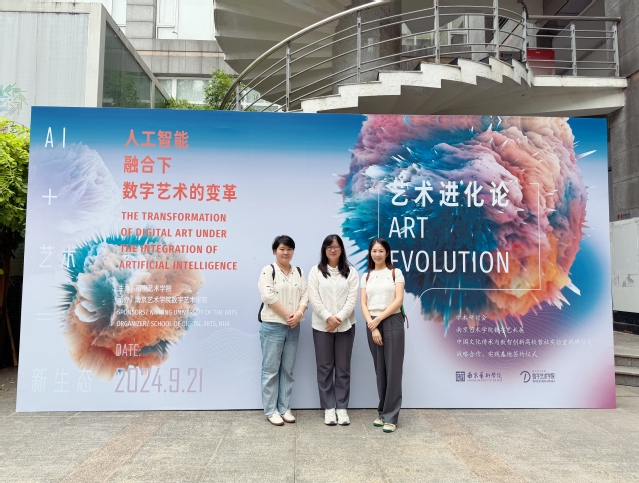 会议期间,王丽莉一行参加了由南京艺术学院主办的“人工智能融合下数字艺术的变革”论坛活动,聆听了华中科技大学建筑与艺术学院副院长蔡新元、同济大学设计创意学院副院长曹楠、浙江大学计算机科学与技术学院副院长孙凌云、中央美术学院教授费俊等行业专家的精彩主题报告。下午,“可持续创新—中国人工智能艺术教育协同创新平台江苏分中心成立大会”在南艺传媒学院报告厅举行。蔡新元介绍了中国人工智能艺术教育协同创新平台,与南京艺术学院传媒学院副院长盛瑨共同为分中心主任单位、副主任单位、成员单位颁发证书并进行人工智能艺术教育研讨。