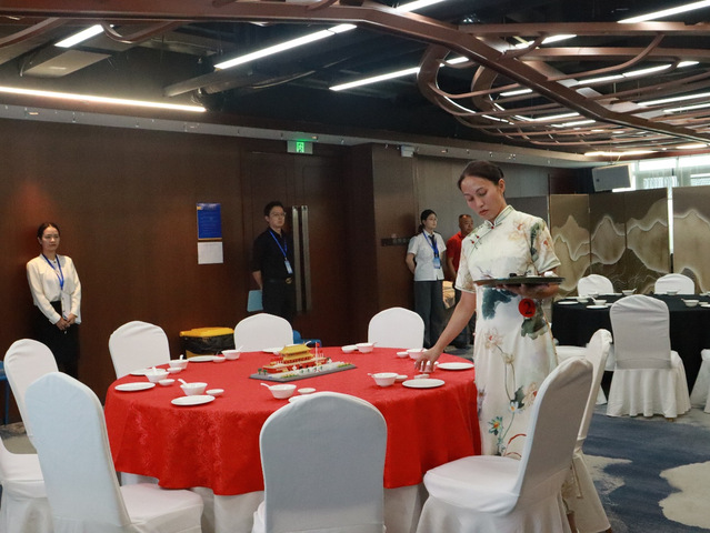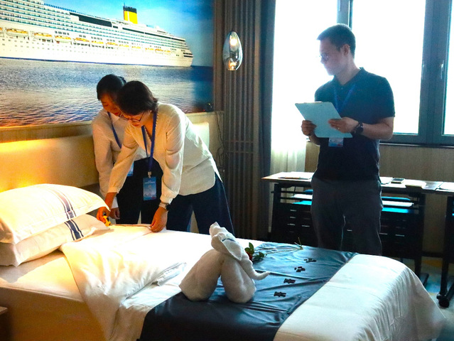 邮轮与艺术设计学院承担本次旅游服务(导游)赛项实操部分的组织与考试工作,包括中餐摆盘、客房服务和导游服务等分赛项。学院积极组织赛事筹备,搭建了符合比赛要求的模拟旅游接待环境,并制定了详细的考试方案。在赛事的组织过程中,邮轮与艺术设计学院的师生团队发挥了重要作用。教师团队为比赛设计了严谨的评分标准,确保每个环节的评分具有科学性和可操作性。学生志愿者则在考场管理、设备调试、后勤保障等方面提供了周到的服务,确保了赛事顺利进行。经过数天的紧张筹备与彩排演练,学院顺利完成所有赛程考试保障工作,得到了大赛组委会和参赛选手的一致好评。