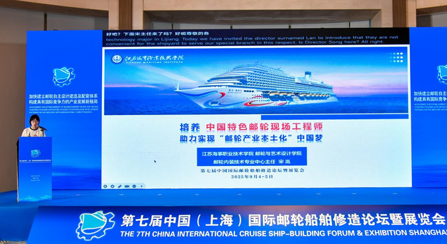 论坛环节,邮轮内装中心主任宋岚受邀发表主题演讲,以“培养中国特色邮轮现场工程师,助力实现‘邮轮产业本土化’中国梦”为核心议题,系统阐述了学院在邮轮现场工程师培养体系构建、课程内容与行业标准衔接、实践教学基地建设等方面的探索成果,同时结合国内邮轮产业发展需求,提出了“产教融合赋能邮轮人才培养”的具体路径。演讲内容兼具理论深度与实践指导性,紧密契合行业发展痛点与国家战略需求,赢得了现场嘉宾的广泛认可与高度评价。