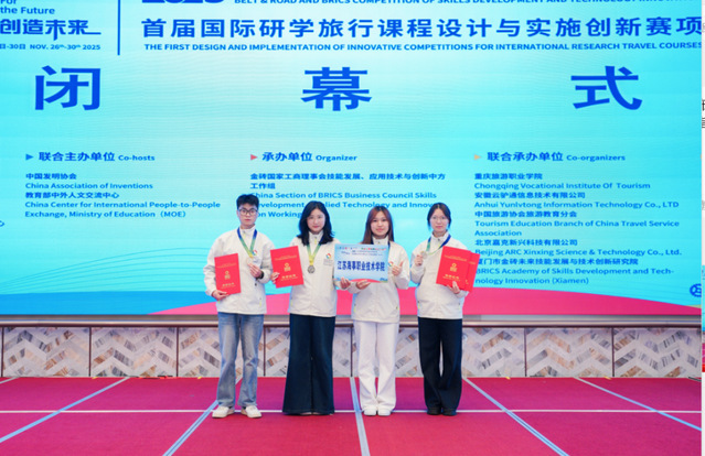 近日,2025年一带一路暨金砖国家技能发展与技术创新大赛首届国际研学旅行课程设计与实施创新赛项全国总决赛在重庆旅游职业学院成功举办。由邮轮学院顾佳莹、蔺博宇、张梦婷、王晶晶等同学组成的参赛团队,在指导教师李珊英、彭鹏的指导下,以创新的课程设计和稳定的现场发挥,从全国参赛队伍中脱颖而出,荣获全国二等奖(银牌),我校荣获“优秀组织奖”。